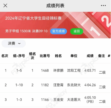 7月27日,由辽宁省教育厅、辽宁省体育局主办的2024年辽宁省大学生田径锦标赛在沈阳体育学院落下帷幕。我校新能源学院新材料211班许彦鹏同学,在甲组男子1500米和5000米比赛中,分别以4′03″71和15′34″69的成绩获得冠军,再次刷新由他本人创造的我校学生男子1500米和5000米纪录,两项成绩均达到了国家二级运动员标准,其中1500米成绩超过了丙组(体育专业组)冠军选手0.14秒,5000米成绩超过了丙组(体育专业组)冠军选手6.17秒,实现了我校学生体育竞赛成绩的重大突破。